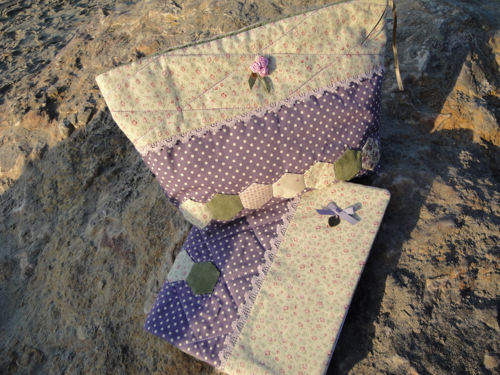 Un par de telitas que coordinen, puntilla, cintas, charms y poco más para hacer este conjunto de neceser y funda de libreta para apuntes.