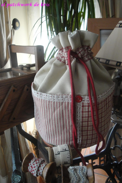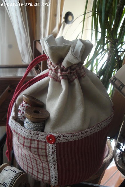 Así ha quedado mi nueva bolsa - costurero, de estilo romántico, que empezaré a utilizar en los talleres del próximo curso.