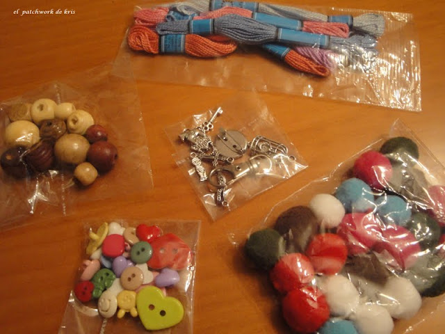 Le hemos enviado telitas, botoncitos, charms, bobinas de hilo de bordar antiguas, algún carrete de madera y tijeras, en fin lo que ella nos pidió!!!! lo que necesita para trabajar!!!, y le sirviera para ilustrar el libro.